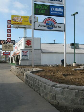 The owner of this business needed an area to diplay their ATVs. Real Escapes provided a great solution by raising the display area about 2 feet above the sidewalk level using our Allan Block Rocks. He then added landscape rock and plants to create a low maintenance display area. |